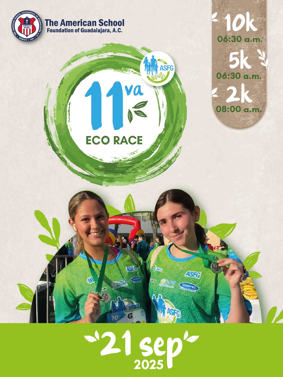 THE AMERICAN SCHOOL FOUNDATION OF GUADALAJARA, A.C. con el AVAL DE LA ASOCIACIÓN JALISCIENSE DE CLUBES ATLÉTICOS AJCA. CONVOCA a estudiantes, padres de familia, exalumnos, staff,, familiares de esta institución, corredores de todas las asociaciones afiliadas a la Federación Mexicana de Asociaciones de Atletismo A.C., y público en general, a participar en la onceava carrera ECO RACE ASFG 2025. ¡Te unes!