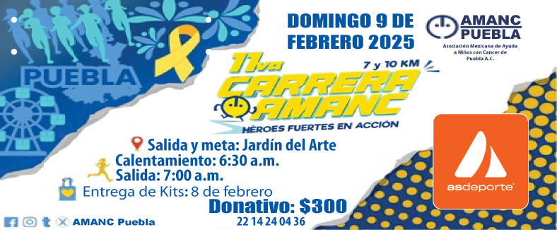 Jardin del Arte Puebla C. Sirio S/N, Reserva Territorial Atlixcáyotl, Centro Comercial Puebla, Puebla, Puebla, Mexico7k y 10k. ACERCA DEL EVENTO ¡Bienvenidos a la 11 ª Carrera AMANC Héroes Fuertes en Acción 7 km y 10 km 2025! www.asdeporte.com es un medio de difusión y promoción de eventos deportivos, así como una plataforma para la captación de inscripciones al servicio de los organizadores de eventos en general. Datos de […]